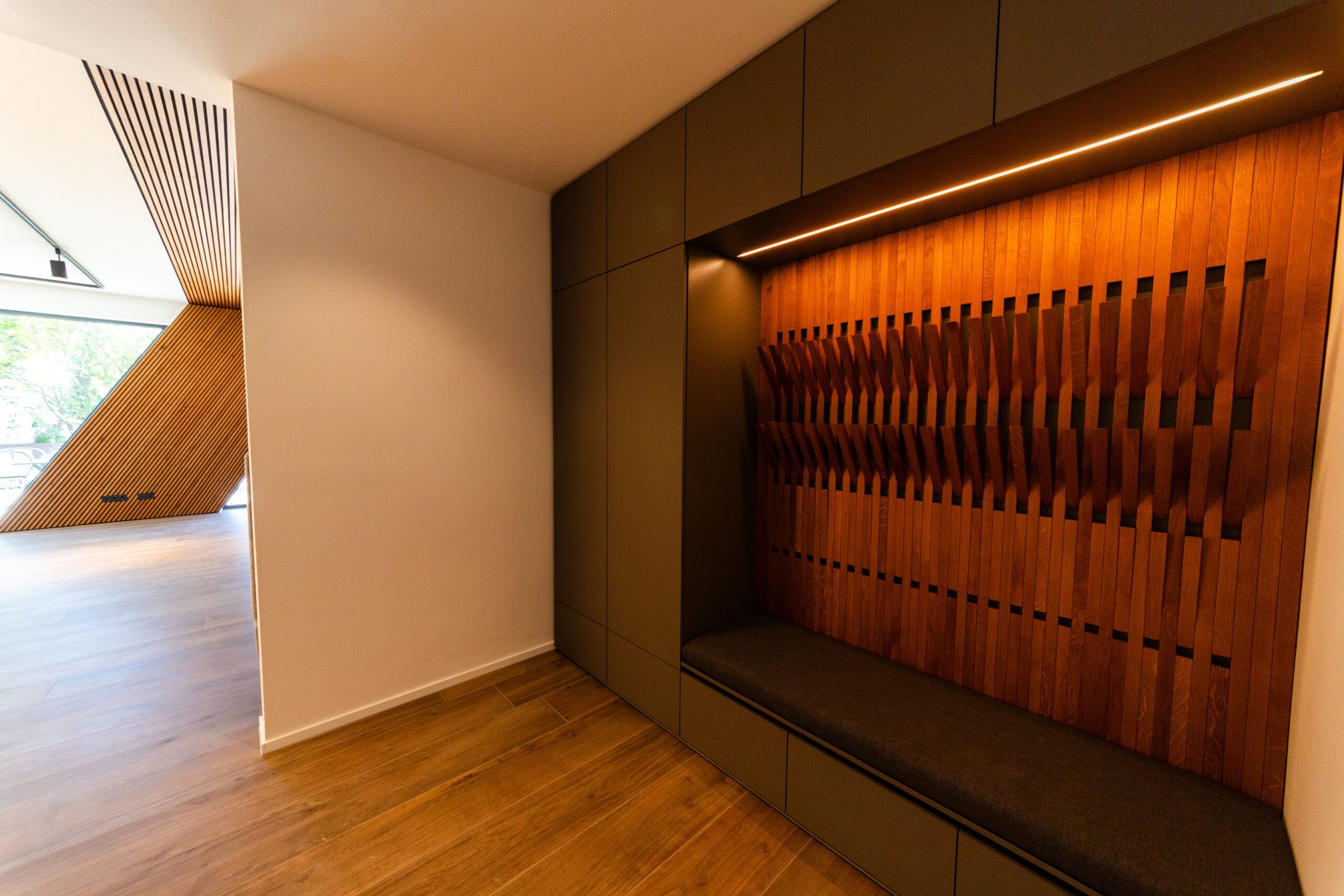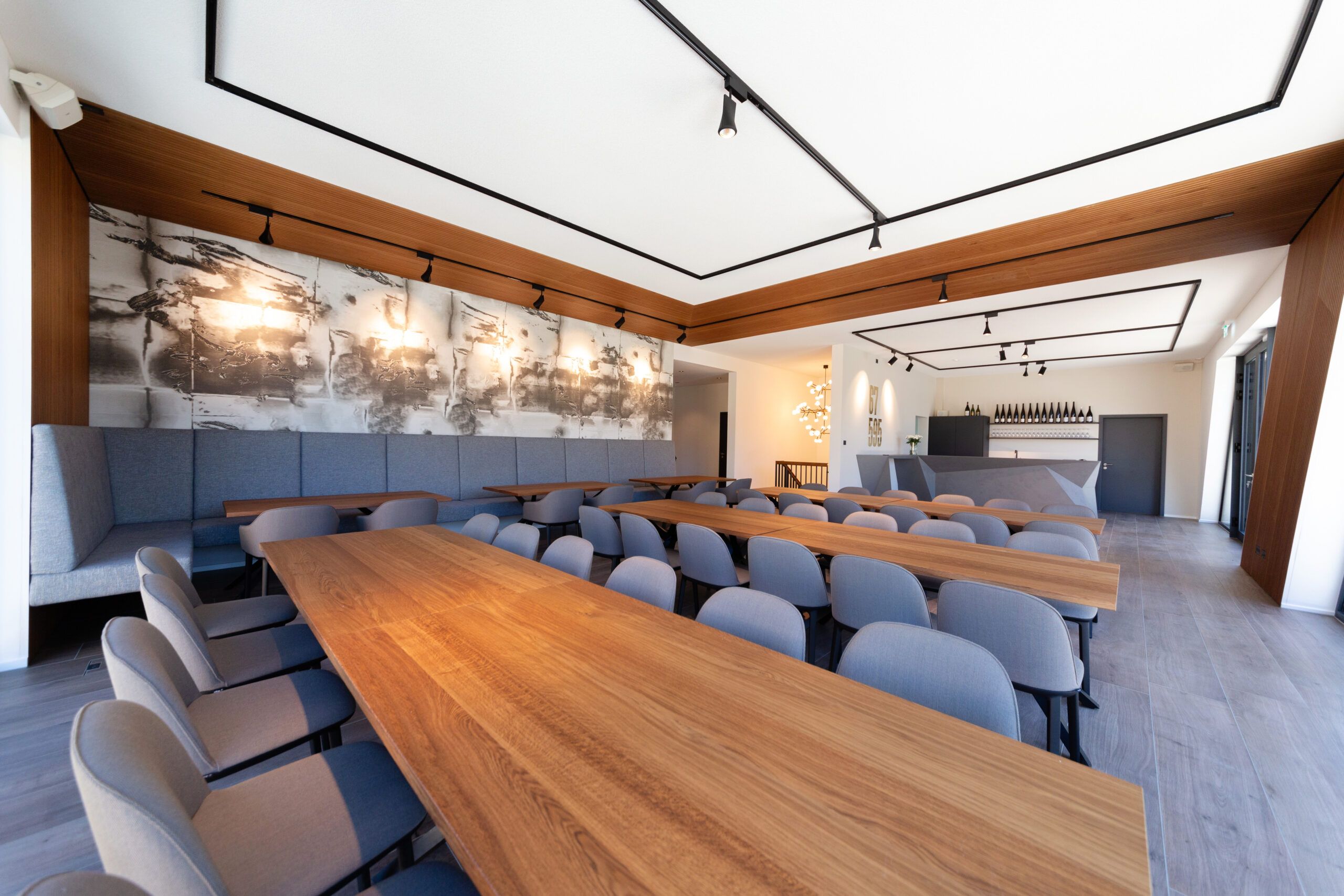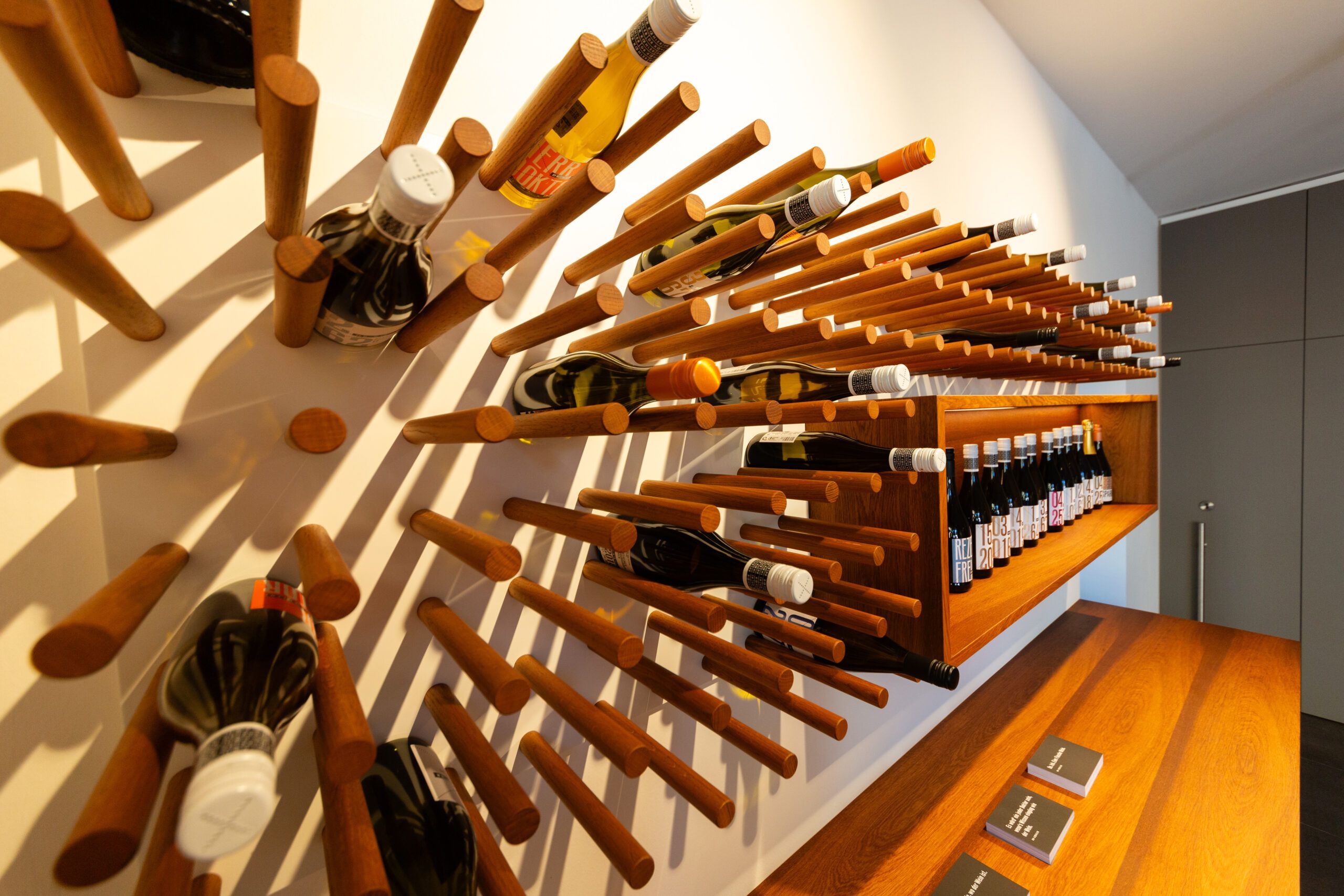 In enger Zusammenarbeit mit den Architekten und dem Bauherrn entstand ein Neubau, der mit warmen Farben und einer durchdachten Materialwahl eine einladende Atmosphäre schafft. Von der Vinothek mit Keramik-Arbeitsfläche und massiver Theke im Erdgeschoss bis zur Garderobe im Obergeschoss – wiederkehrende Farben und Materialien verbinden die Räume harmonisch und verleihen dem Projekt einen stimmigen, modernen Charakter.